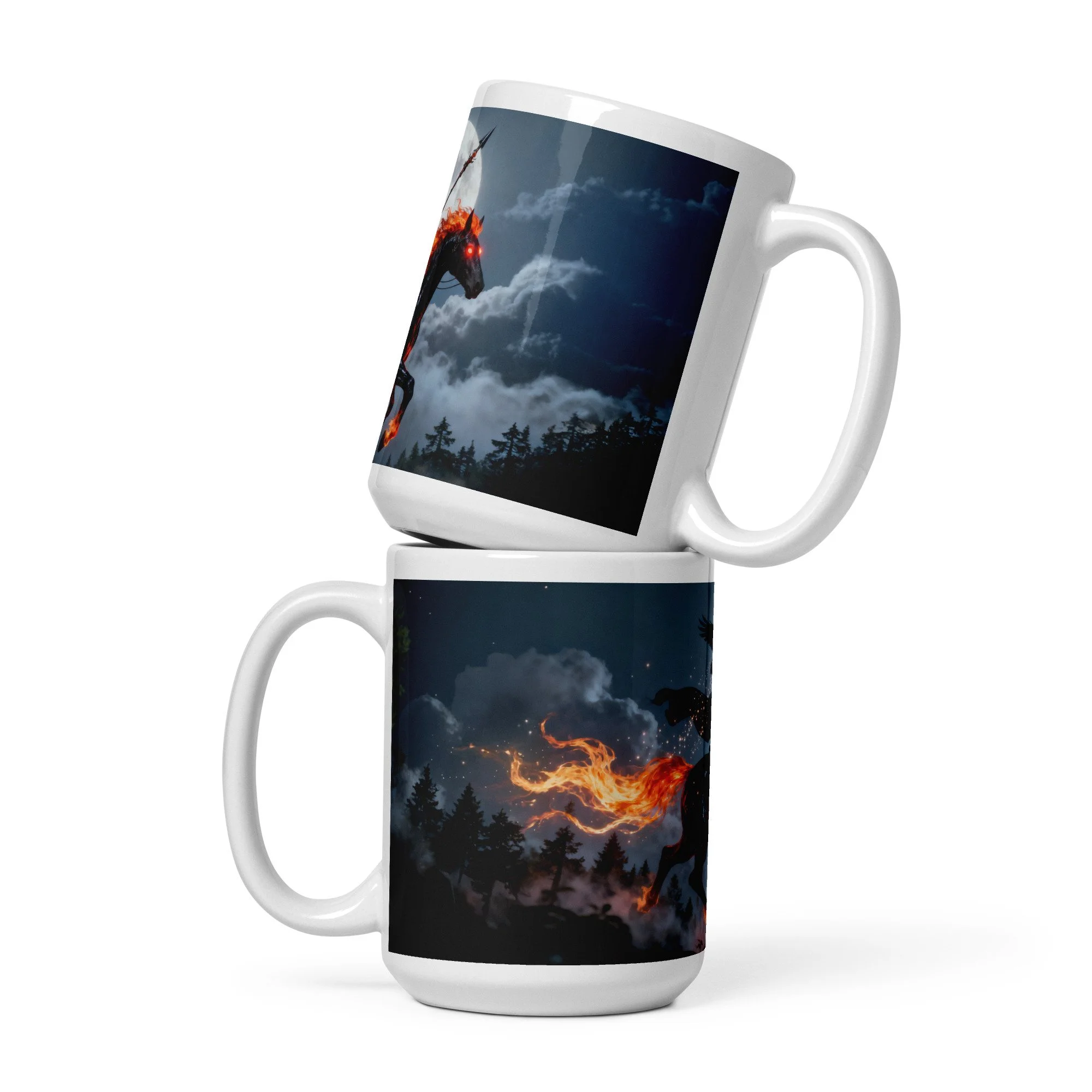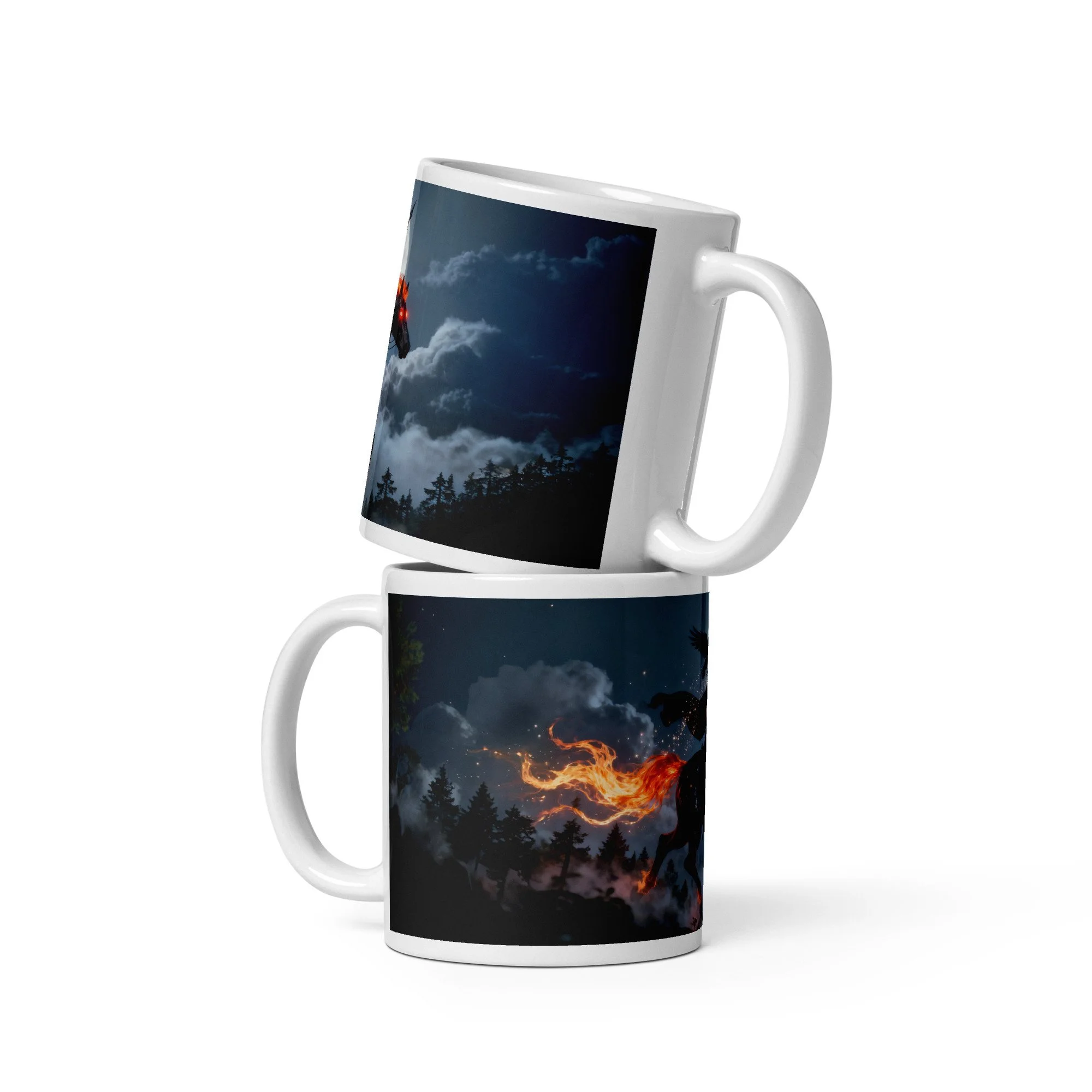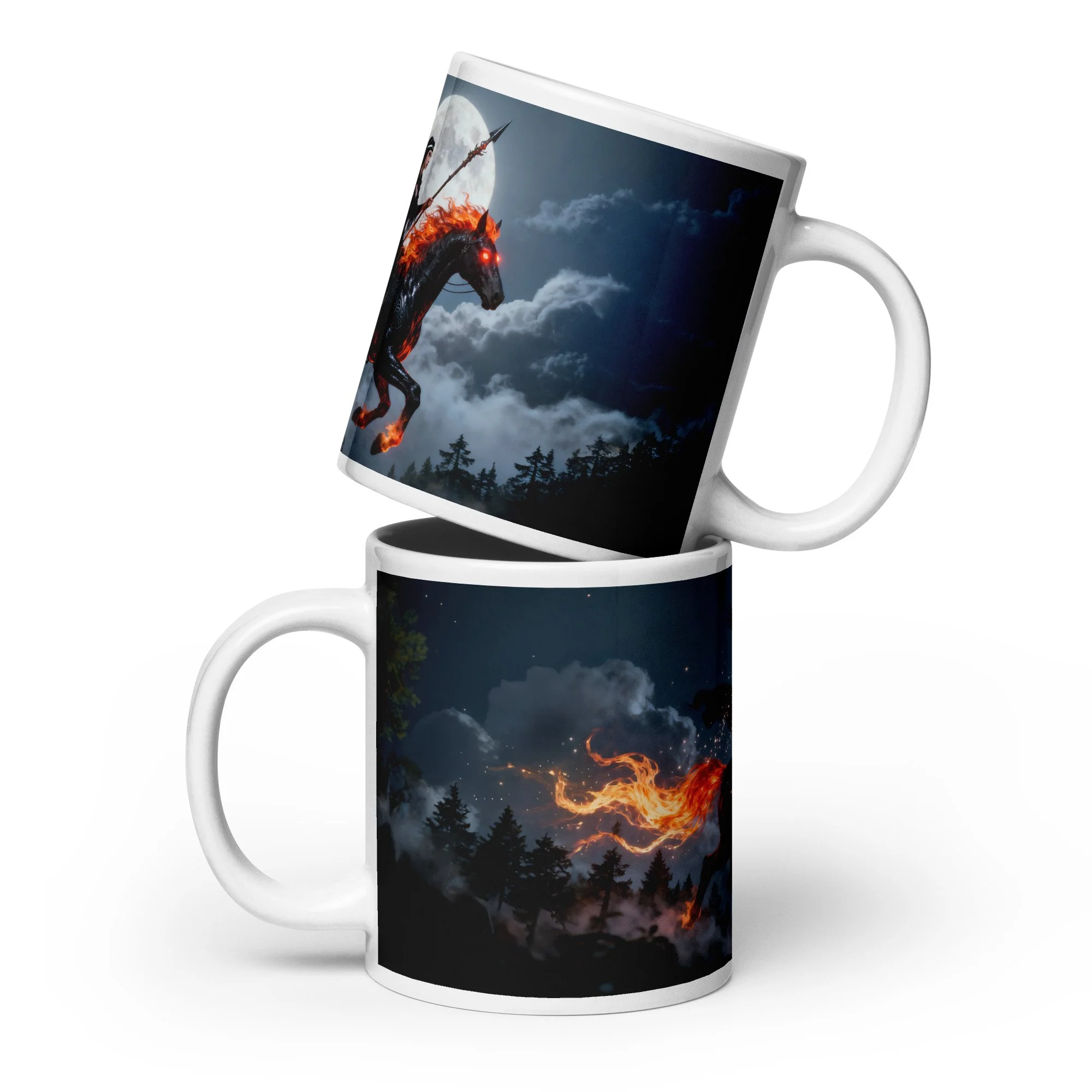 This mug has the creator's interpretation of the Celtic legend of Samhain and the Goddess Morrigan and the mischievous Puca. They are both enjoying the Samhain evening.